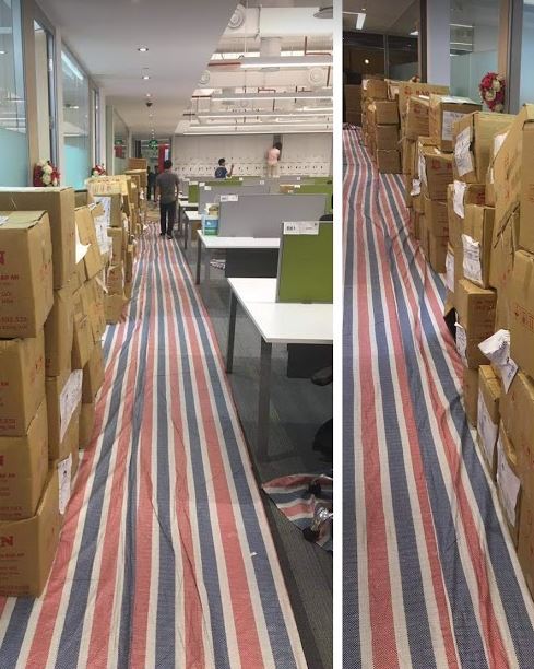Chúng tôi sử dụng bạt dứa để phủ lên mặt sàn văn phòng tất cả những vị trí di chuyển thường xuyên, vị trí đặt thùng để đảm bảo thảm không bị rách, bị bẩn.