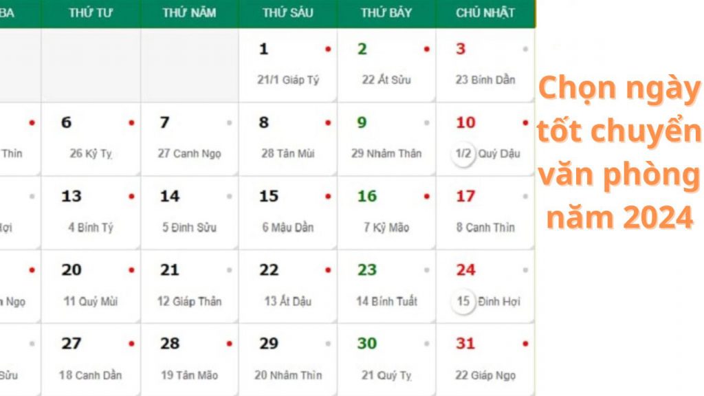 - Thứ Sáu, ngày 2 tháng 2 năm 2024: Ngày này được coi là ngày tốt cho việc khai trương, khởi công, rất phù hợp để chuyển văn phòng mới.